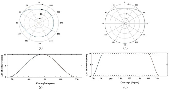 The regular cam shape (Figure 3a,c), which is capable of opening and closing the valve using a single cam, was generated using MATLAB code. During the rise phase of a standard cam mechanism, the lift angle is 65 degrees, and the duration of lift is 1 unit. Similarly, during the fall phase, the lift angle is 65 degrees, and the duration of lift is 229 units. In a desmodromic cam mechanism (Figure 3b,d), the ascent angle is 65 degrees, and the dwell period during the rise phase is 229 units. Similarly, the descent angle is 65 degrees, and the dwell period during the fall phase is 1 unit.