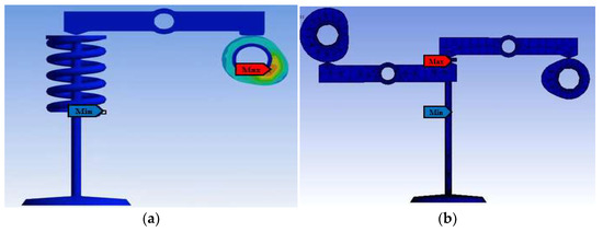 In the case of the conventional valve mechanism, there are two primary locations shown in Figure 4 where stresses occurred: the lower end of the spring and the base circle of the cam profile. Upon analysis, the maximum stress observed at these points was found to be 3.3566 × 10−6 MPa, while the minimum stress recorded was 2.5399 × 10−19 MPa. Within the desmodromic valve system, stress was distributed across various components such as the rocker arms and cam profiles. However, the valve stem bore the highest stress levels. With a maximum stress of 113.56 MPa and a minimum stress of 3.9438 × 10−11 MPa, it is imperative for the valve stem to exhibit sufficient strength to withstand these stresses and avoid any deformation or failure. When comparing the engine torque, the traditional valve system produced an engine output torque of 105 Nm, while the desmodromic valve system generated 120 Nm, which was calculated by considering the forces acting on the system and the moment arms associated with those forces. The mass of engine was increased by only 2.75 kg using the desmodromic valve mechanism instead of the traditional spring-based mechanism.
