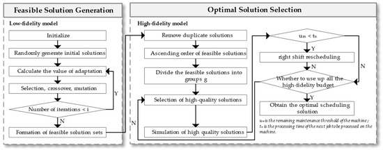 It consists of two modules: feasible solution generation and optimal solution selection. The feasible solution generation module employs a GA to quickly generate feasible solutions. The optimal solution selection module uses the Enhanced Optimal Computing Budget Allocation (EOCBA) method to select high-quality solutions; the high-fidelity simulation, considering the PM of the machine, prevents the increase in makespan caused by machine failures; and the optimal scheduling scheme is chosen from the high-quality solutions based on the simulation results. The flowchart of MOAPMM is shown in Figure 1.