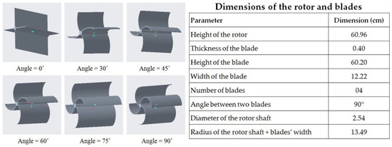 The inlet channel was separated into two channels through a divergence of 60°, which reduced the inlet dimensions to half at the both edges of the divergence. As a result of the reduction in area by half computed through equation of continuity (A1 × V1 = A2 × V2), the inlet velocity (0.5094 m/s) was doubled and became 1.019 m/s at both edges of the divergence. This increased velocity can be used effectively to rotate the vertically placed (two) rotors after the divergence. To achieve maximum moment/torque, the angle of the rotor’s blades was varied from 0 to 90° curves as depicted in Figure 2. The dimensions (cm) of the rotor and blades are also displayed in Figure 2. The theoretical value of RPM of the rotor is 72, which was computed by dividing the velocity of the fluid (61.14 m/min) by the circumference of the rotor (0.8463 m).