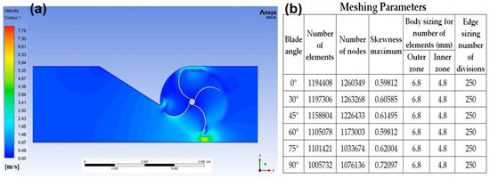 (a) Contour of simulation, (b) Meshing parameters and number of elements for different blade angles.