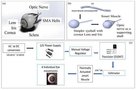 The model underwent testing and physical analysis using an open-loop control system. A fixed voltage of 0–12 V was acquired as an output whereas the muscle was activated on 2.8 V and 1.5 A. The muscle was stretched to twice its original length using hand force, and then contracted back by applying a stimulus in terms of joule heating via voltage from a control system. The smart muscles’ shape memory effect enabled them to deform and move the eye. Four muscles were given individual stimuli to observe desired movements, including elevation, depression, adduction, and abduction. Figure 1d shows the block diagram of a control system.