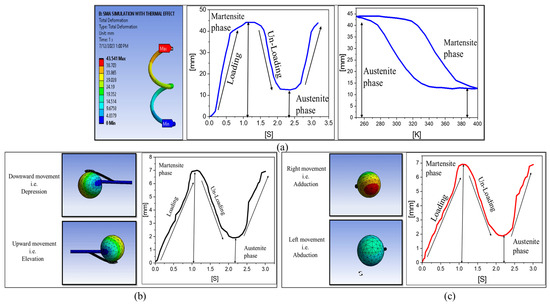 The simulation results are shown in Figure 1a–c. It was observed that the maximum displacement in the case of SMM was 43 mm, greater than the original length of 28 mm, i.e., 28 − 43 = 15 mm. The results have been validated with the constitutive model based on Hencky strain [8]. Meanwhile, the shape memory helix attached to an eyeball gave a maximum displacement of 6.8157 mm in all four cases but with different axes, two movements in the horizontal axis (+x, −x) and two in the vertical (+y, −y). Figure 2 shows the simulation results.