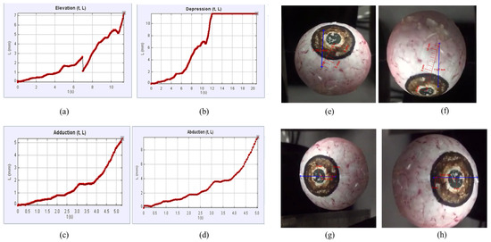 Tracker graphs acquired against all primary eye movements: (a) elevation caused by superior rectus (b) depression caused by inferior rectus (c) adduction caused by medial rectus (d) abduction caused by lateral rectus Prototype eye model movements: (e) upward movement, i.e., elevation; (f) downward movement, i.e., depression; (g) leftward movement, i.e., abduction; (h) rightward movement, i.e., adduction.