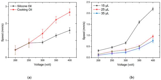 (a) Droplet speed against applied voltage for silicon and cooking oil; (b) droplet speed with changing droplet volume.