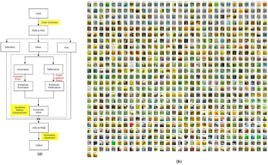 Image processing: (a) process of image enhancement and (b) image dataset with labels.