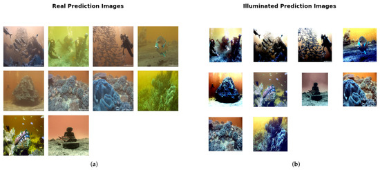 Figure 2. Comparison of predicted images: (a) real predicted images and (b) illuminated predicted images. - Quantitative Comparison: Figure 3a shows the RGB histogram of real images, which is evenly spread, whereas, Figure 3b shows the RGB histogram of illuminated images, which has more luminance in a white scale. Figure 4a shows the training accuracy of the system, where it achieved its accuracy within a few epochs despite trying to avoid overfitting. Figure 4b shows the training loss that also reaches minimal after a few epochs. Figure 4c shows the confusion matrix. It is conclusive that the proposed method was quite efficient in enhancing the underwater images. The CNN trained on labeled images real and enhanced was able to accurately differentiate between the two different image qualities.