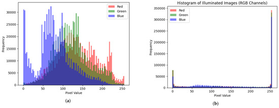 Figure 3. Histograms of images: (a) histogram of real images (RGB) and (b) histogram of illuminated images (RGB).