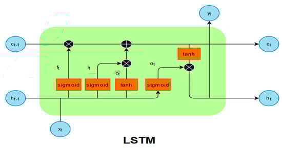 Long Short-Term Memory (LSTM) networks are a type of recurrent neural network (RNN) architecture that has gained popularity for their ability to learn long-term dependencies in sequential data, making them particularly well suited for complex time series forecasting and natural language processing tasks [8] (pp. 5929–5955). The LSTM architecture is a more complex form of RNNs as compared to GRUs, and that is why they tend to remember more complex information. They consist of forget gate , candidate layer , input gate , output gate , hidden state (represented by letter ) and memory state (represented by letter ). The internal cell structure of LSTM is shown in Figure 3 below.