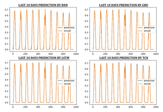 After training the models on the entire year’s data, excluding the last 10 days designated as the test set, the model’s accuracy was assessed. The LSTM model achieved the highest R-squared value equal to 0.993406, indicating it outperformed the others. The GRU model ranked second with an R-squared value equal to 0.992509, followed by the TCN model with an R-squared value equal to 0.992405 and the simple RNN model with an R-squared value equal to 0.991935.