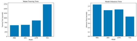 The training and inference time taken by each model are shown in Figure 6, which shows that RNNs took the least amount of time to train but also took the most time for inference, and for TCN, the opposite happened: it took the most amount of time to train, but during inference, it was the fastest among them all: