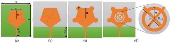 The antenna is simulated using HFSS (high-frequency Simulation software) with an overall dimension of 16 × 16 mm2. The proposed antenna consists of a pentagonal-shaped patch with a full ground configuration. The design of the first-step antenna is shown in Figure 1a.