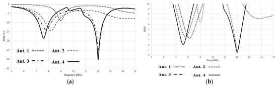 In this case, the VSWR of the antenna is given as 0.565 at a frequency of 12 GHz, as shown in Figure 2b. This means that there is a mismatch between the antenna and the transmission line, and the reflected signal has a magnitude of 0.565 times the forward signal. The combined VSWR of the different antennae is shown in Figure 3. Antenna gain is a measure of the antenna’s ability to direct or focus radiated energy in a specific direction. It is usually expressed in decibels (dB) relative to an isotropic radiator (a theoretical antenna that radiates equally in all directions) [13]. In this case, we obtained the antenna gain at two different frequencies: 7.13 dB at 7.6 GHz and 8.07 dB at 12 GHz. This means that the antenna has a higher gain at a higher frequency. Also, the gain of the proposed antenna is greater than the previous antenna discussed in this paper.