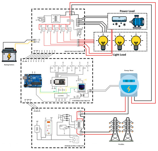 The power supply circuit of the energy meter contains a Buck converter and Voltage regulator ‘7805’. This circuit contains three pins—VCC, ground and 3.3 V. 3.3 V is for ESP32 and OLED display. This power circuit contains high voltages on terminals. The following pins in the power circuit are then connected to the power supply circuit to get low voltage DC power for relays, optocoupler, and also connect CT to its conditioning circuit. The output of the power circuit is then fed to the power supply circuit. In this energy meter, we need three voltage levels, which are 12 V for relays, 5 V for CT and other transistors and 3.3 V for the ESP32 microcontroller. A full wave bridge rectifier is used to convert AC voltages into direct current voltages in the circuit of the power supply. The level of voltage directly adopted by the bridge rectifier is 12 V. These 12 V are then fed to the “7805” voltage regulator to get 5 V and to the buck converter to get 3.3 V. The signal conditioning circuit of the current transformer and potential transformer is connected to their secondary for sampling. The output of the signal conditioning circuit along with other control pins for relays and voltages are combined on the bottom-right portion of the circuit for the last control circuit. The control circuit of the smart energy meter consists of Arduino UNO, the ESP32 microcontroller, and an OLED display. The OLED display is used to display results on the screen. One Current Transformer (CT) is connected to the load-side phase wire to measure load current. There are some NPN-type transistors that are used to control relays that will turn ON or OFF lights and power loads. The output of the power supply circuit is connected to the input pins of the control circuit. There is an external power source available for relays to operate because relays need constant voltage. The overall circuit diagram meter is shown in Figure 1.