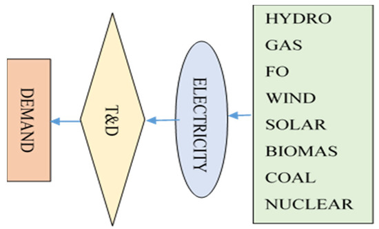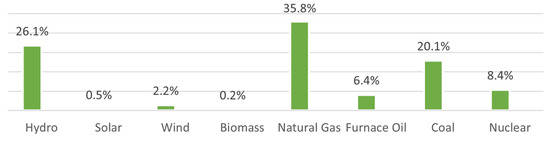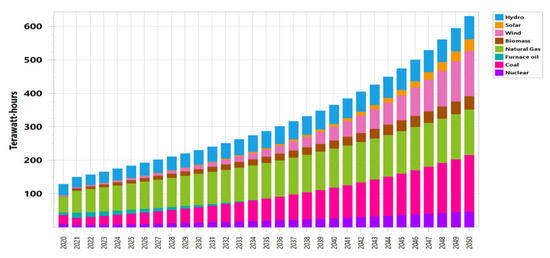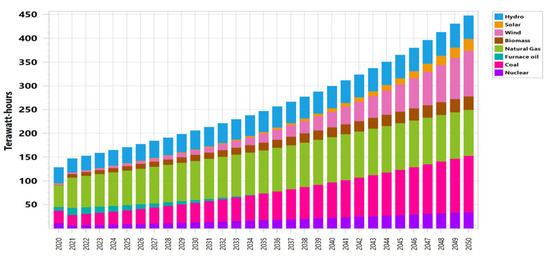 Currently, Pakistan’s total power generation capacity is coming from various energy resources. The energy mix, as shown in Figure 1, comprises natural gas 35.8%, hydroelectric 26.1%, bituminous coal 20.1%, furnace oil 6.4%, nuclear power 8.4%, wind power 2.2%, and solar PV 0.5%, respectively [1]. As per the Economic Survey 2020–21, Pakistan’s installed capacity to generate electricity increased to 37,261 MW by July 2020 from 22,812 MW in June 2013 [2]. Pakistan is still facing an energy crisis, even though it has a power generation capacity that is larger than the demand capacity of power. According to the Pakistan Economic Survey 2019–20, the installed power generation capacity in 2020 was 37,402 MW. The greatest total demand from domestic and industrial estates was nearly 25,000 MW, whereas the transmission and distribution capacity was roughly 22,000 MW. When demand is at its highest, this results in a 3000 MW deficit. Even though the country’s peak demand is significantly below its installed capacity of 37,402 MW, the additional 3000 MW required cannot be supplied to consumers.