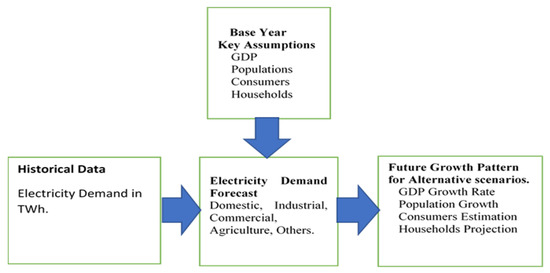 Various energy modeling tools are used throughout the entire world for energy planning and policy making. These modeling tools include the low emission analysis platform (LEAP) system, which is employed as a modeling tool for energy accounting to predict electricity demand and pair it with available generation capacity [8]. Figure 2 and Figure 3 show the structure of LEAP for predicting energy demand and generating energy. In LEAP, the energy demand module predicts energy demand by examining demand. In order to predict the energy demand, the bottom line of the various sectors of energy consumption is taken into account, which includes domestic, industrial, commercial, agriculture, and others. A key input for the energy demand module is the total population, household, consumer, and historical data on energy consumption, Gross Domestic Product (GDP), growth rates, and projections [9,10]. The energy production module in LEAP forecasts energy production utilizing the transformation module. Domestic energy assets are used for energy production, and transformed energy as an input to energy products is modeled using a variety of energy production technologies. The data required for the energy production module include base year exogenous capacity, energy production, system efficiency, maximum availability, system lifetime, and technology selection [11].