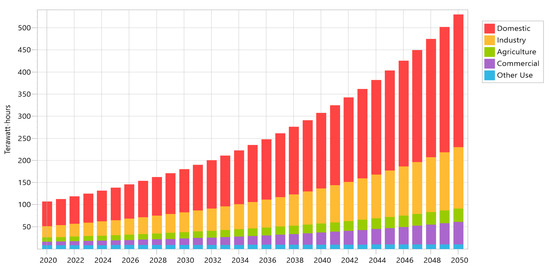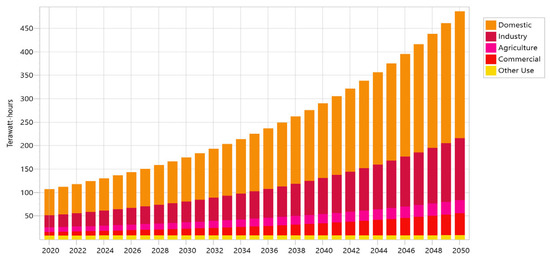 We ran projections for both scenarios’ electricity consumption from 2020 (the “base year”) to 2050 (the “target year”). The two futures share a trend of rising electricity demand due to rising populations, rising living standards, and expanding economies. These trends will continue until 2050. Figure 4 displays the increase in electricity demand from 2020 to 2050 under the BAU scenario (107 to 530 thousand GWh), while Figure 5 displays the increase in electricity demand under the DSM scenario (107 to 403.4 thousand GWh) from 2020 to 2050. DSM tends to result in a 29% decrease in electricity generation compared to the BAU scenario in 2050.