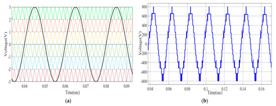 Three-level inverters are widely used for power compensation as an alternative to medium- and high-voltage applications. The three-level inverter is widely used in industrial applications due to its simplicity [10]. There are three input waves, including one sinusoidal modulating signal and two triangular carrier waves of a magnitude of 1 volt, as presented in Figure 1a. Furthermore, the simulation output is shown in Figure 1b. Line-to-line voltages are also displayed for simplicity and better understanding.