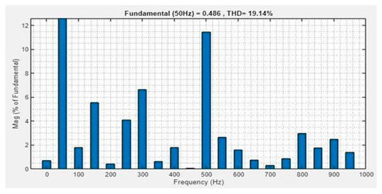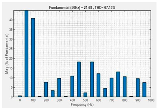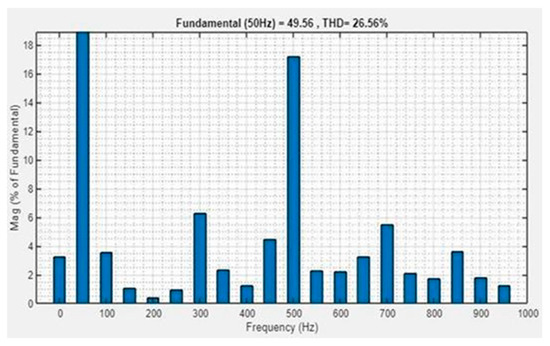 Variations in both switching angles and DC voltages of the inverter affect the power quality of the output voltage of the inverter. It can be reduced by using filters between the inverter and load or by increasing the number of levels. A Fast Fourier Transform (FFT) analysis is typically used for THD calculation in SIMULINK®. Furthermore, Figure 4, Figure 5 and Figure 6 represent the results of a FFT analysis done in simulation.