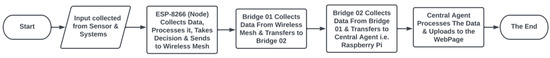 The system architecture in Figure 1 shows the interconnected nodes forming a mesh topology. Data from the sensors connected to each node are sent to the Central Agent through bridges. The Central Agent transfers the data to Firebase, where it is stored, and a web server displays it. The block diagram depicted in Figure 2 illustrates the complete data transfer in the system in a step-by-step manner. The integrated system ensures reliable and sustainable operation.