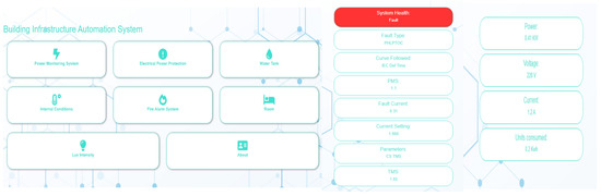 The proposed system provided the desirable outcome. The wireless transmission of data from the nodes to the main webserver was achieved. The integration of the electrical protection system with the building management system has been achieved for the first time. It was able to protect the building against any form of electrical fault, in case of any fault generated the protection system was able to isolate the faulty area, thus preventing total power failure and enhancing the system’s reliability. These results were shown on the main webpage as well, as depicted in Figure 4. The fire alarm system was able to detect smoke and gas, and when exposed to these elements, the quick response of the system alarmed the users. Moreover, the temperature control system efficiently managed the temperature through the controlling of air conditioners, thus maintaining a steady-state temperature. Additionally, the water management system was tested with a jar of water, just as water level would drop below 3 inches, it would start the motor for the refilling of the tank. Another smart feature worked well, which was lux intensity control; with the day light, it turned off the lights while just as the lux level decreased, it successfully turned the lights on.