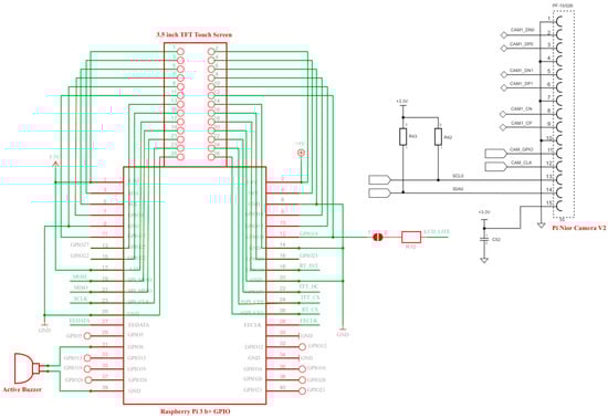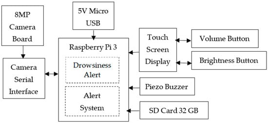 The block diagram depicting the proposed system is presented in Figure 1. Raspberry Pi 3 serves as the main microcontroller for this system. The system is powered by a 5 V Micro USB connected to the car adapter. The Raspberry Pi NoIR Camera V2 is linked to the main controller via a camera serial interface. The main controller directly connects to the Touch Screen Display and active buzzer, which serve as system outputs. To store data, a 32 GB SD Card is utilized in this system.