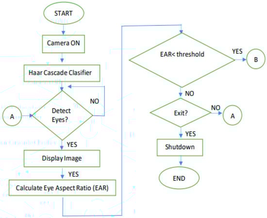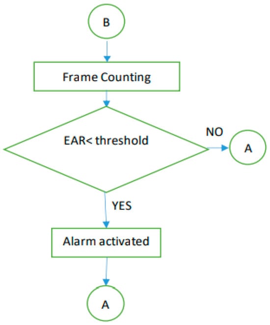 During the sub-process labeled as B, the camera continuously monitors the driver’s eyes’ aspect ratio (EAR) and counts the frames if the EAR falls below the set threshold. If the count of frames is below the required threshold, the process returns to point A. However, if the count of frames reaches the specified consecutive frames threshold, the alarm is triggered. The process then loops back to point A again. This entire process continues until the device is turned off or shut down.