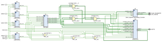 Figure 2, initially, the system is in the “idle” state; the system is ready for use, waiting for the reset signal to transition. In the “security_activated” state, the owner enters a secret switch code to initiate the security system. The “voting_on” state allows voters to cast their votes using push buttons, with a limit of 99 votes. Upon reaching the limit, the system transitions to “voting_off” and displays the winner in the “display_result” state. The owner can also force-stop the process using the “force_stop” state.