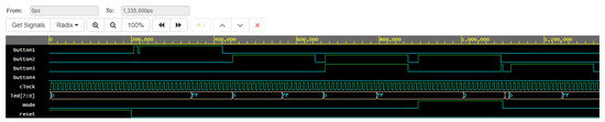 Figure 4 that at 200,000 picoseconds (ps), Button 1 was pressed for a very brief duration, resulting in no alteration of the state of the LED. However, when Button 1 was pressed for an extended duration, the LED state transitions to off, which signifies that the vote has been successfully recorded and validated. Likewise, Button 2 was pressed twice in the case of candidate 2. Upon switching to mode 1, which displays the results, it becomes evident that two votes were duly registered for candidate 2. The timing diagram provides strong evidence that the simulation faithfully represents the system’s behavior. This validation allows us to confidently move forward and conduct hardware testing for this system.