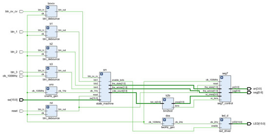 Figure 5 includes four buttons on the left-hand side. The btncvov button is reserved for the authorized officer to start and stop the voting process, while btndebounce resets the system. As part of its basic security features, the Basys3 FPGA board utilizes a specific sequence of all 16 switches to generate a unique key. This key is used to initiate and terminate the voting process, ensuring a secure and controlled operation. btn1, btn2, and btn3 are used to input candidate votes, allowing a maximum of three voters in this implementation of the voting system of FPGAs.