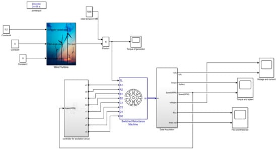 Using MATLAB/Simulink, R2021b a mathematical model for Switched Reluctance Machines was created in which a Switched Reluctance Machine (SRM) was directly connected to a wind turbine and operated it as a generator. To control the Switched Reluctance Machine (SRM) output voltage, an excitation control circuit was used. The Switch Reluctance Generator (SRG) is controlled with a four-phase half-bridge power converter with four legs. During operation, selected stator poles are energized. Rotor poles which are near to energized stator poles are attracted. When the poles are sufficiently attracted, the phase current via diodes begins to charge the DC link capacitor. By checking the DC link voltage, the excitation control circuit switches to the subsequent phase through a power electronics converter. In this way, it controls the DC voltage according to the reference above. The excitation circuit is shown in Figure 2 and Figure 3, and the complete model is shown in Figure 4 developed in MATLAB/Simulink environment. For simulation purposes, the rated DC voltage is taken as 200 V, the turn-on angle is taken as 13 degrees, and the turn-off angle is taken as 23 degrees. Simulations are carried out in MATLAB. The developed model is based on general voltage equation of switched reluctance machine which governs the stator current of SRG.