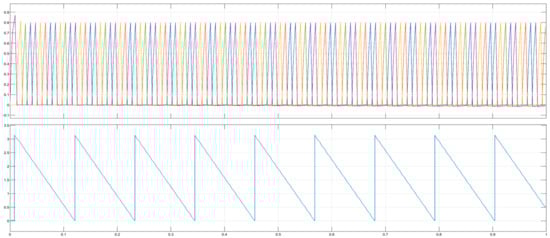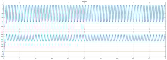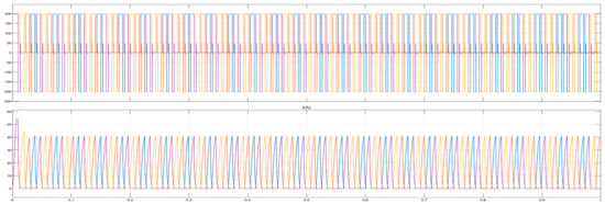 Generator output voltage (upper waveform) and current (lower waveform). Purple color shows phase A, Dark yellow color shows phase B, light yellow color shows phase C and blue color shows phase D.