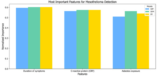 The high feature importance scores for ‘Duration of Symptoms’ and ‘C-reactive protein’, as shown in Figure 2, imply that these features are particularly informative for mesothelioma detection. Clinicians may want to pay particular attention to these symptoms during patient evaluations. This study’s results provide significant evidence supporting the use of ML algorithms for the early detection of mesothelioma. It highlights the effectiveness of GBT, SVM, and LR models, highlighting the relevance of specific patient symptoms in prediction accuracy. This approach has the potential to significantly improve early detection rates and, consequently, patient outcomes.