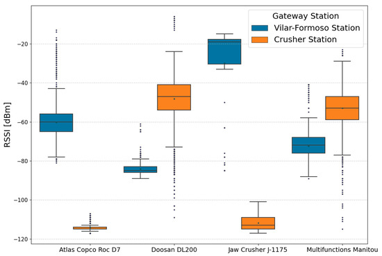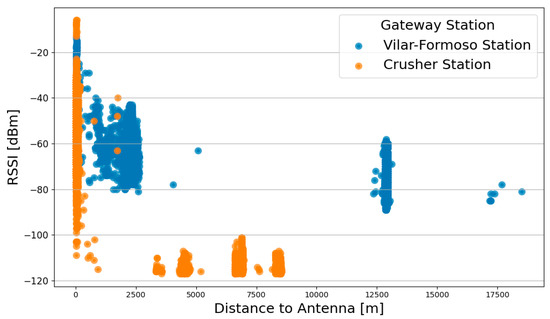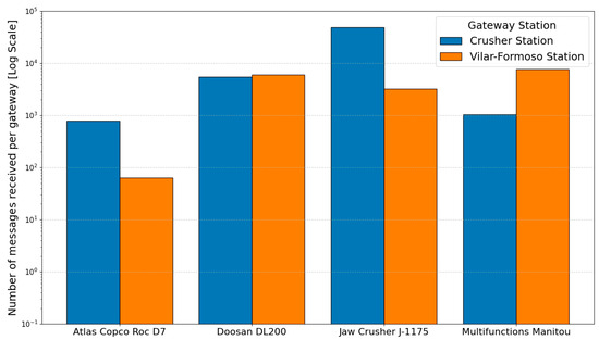 In an actual industrial setting, the dataset includes transmission data from machines like a Multifunction, a Jaw Crusher, a bulldozer Dossan DL200, and a Drill Roc D7. The system uses the data management agent described in previous sections, which systematically collects and organizes device-specific data and gateway information, and the datasets comprise around two months of tests. As part of the monitoring tasks, the distribution of messages at each gateway is required; it is important to evaluate if the allotment and location of the gateways around the construction site are correct. Figure 2 shows message distribution among gateways and each machine, enabling analysis of gateway usage for each machine in our management platforms. In general, the use of the gateway far from the main site (Crusher Station) is greater for most machines, which may be due to its location and where the machines work. Another vital aspect of gateway monitoring is assessing communication quality between the machines and gateways. This dataset allows in-depth analysis for identifying issues related to LoRaWAN network coverage that affect the construction zones communication and eventually the loss of system reliability. Figure 3 demonstrates how gateway monitoring, combined with device in-formation, enables the evaluation of the average RSSI for each gateway–machine pair, aiding in the detection of abnormal data points. This insight helps in defining strategies to prevent future device-to-gateway communication issues. Finally, Figure 4 shows the variation in the communication quality between the gateways and machines over the distance from the antenna. It can be observed that the central station tolerates longer-distance communications, with a noticeable degradation when communication reaches 15 km. In contrast, the Crusher station does not tolerate longer communication distances, presenting a degradation and a maximum tolerance below 9 km of distance. Despite receiving a higher quantity of messages, its tolerance for longer distances can be diminished by its location in a working area, which typically has a less accessible topography.