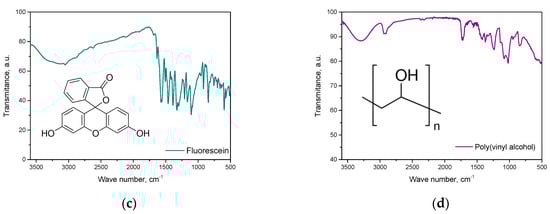 FT-IR spectra of hydrogel materials (a), poli(ethylene glycol) (b), fluorescein (c) and poly(vinyl alcohol) (d).