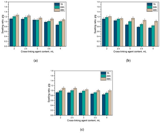 All analyzed materials showed sorption properties. As the amount of crosslinking agent increased, decreasing values of the swelling factor were observed. The amount of crosslinking agent is one of the key parameters influencing the crosslinking process of hydrogel materials and their structure. In line with the amount of crosslinker, the crosslinking density of the material increases, and the amount of free space for the penetrating fluid decreases. The type of incubation medium is also important. The highest values of swelling coefficients were recorded for distilled water. In the case of Ringer fluid and PBS, these factors were much lower. The presence of additional ions in these fluids may influence the formation of additional bonds and interactions, which increases the polymer density of the matrix and limits its sorption capacity. This is not the case for distilled water without additional ions.
