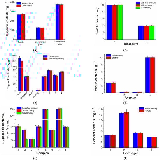 The sensors created were applied to real samples that are typical for the analytes under study. Quercetin and rutin were quantified in water and ethanol extracts from medicinal plant material (St. John’s wort herb, marigold flowers, and bearberry leaves), hesperidin—in commercial and fresh orange juices, taxifolin—in bioadditives, eugenol—in essential oils of clove, cinnamon, basil, nutmeg, and clove spices, vanillin—in perfumes and vanilla essential oils, propyl gallate—in spiked ethanolic extracts of vegetable oils (sunflower and sesame), and α-lipoic acid—in pharmaceutical dosage forms. Synthetic food colorants were determined in food stuff. Soft and isotonic sports drinks were tested for tartrazine and brilliant blue FCF. Sudan I was determined in spiked samples of red hot pepper, smoked paprika, and salmon. The recovery tests showed the absence of matrix effects as long as the recovery values were in the range of 97.1–103%. A sensor for gallic acid was used for the evaluation of the antioxidant capacity of fruit juices in gallic acid equivalents. Positive correlations with standard parameters (antioxidant capacity by reaction with 2,2-diphenyl-1-picrylhydrazyl (r = 0.7477 at rcrit = 0.6319) and total phenolic contents by Folin–Ciocalteu (r = 0.7489 at rcrit = 0.6319)) were obtained.