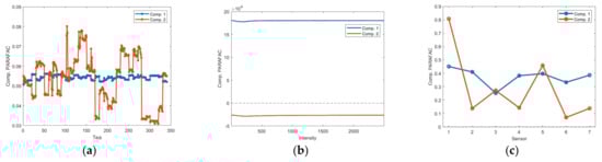 PARAFAC analysis was performed on the formed tridimensional matrix described in Section 2.1. To choose the appropriate number of components, a CORCONDIA evaluation was performed, achieving a core consistency value of 99.2%. This result was close to the 100% described in the literature [12]. Figure 2 shows the PARAFAC components of each loading matrix. The tea loadings represent tea variability; the intensity matrix shows changes in voltage values; finally, the sensor loadings describe the responses of each sensor. As can be seen, in order of importance, the obtained loading can be listed as follows: 1. Loadings for sensor; 2. Loadings for tea; 3. Loadings for intensities. The loadings for the sensor have the highest values and indicate which of the sensors contributes the most to detecting the teas. Sensors 1 and 5 (MQ-7 and MQ-9) for component 2 provide the most, according to Figure 2c. Then, the loadings for tea indicate which teas are dominant in each component. In this case, the teas with the highest loadings for component 2 are the most influential. Therefore, sensors 1 and 5 contribute to the detection of such teas. The loadings for intensities are less representative. In this case, component 1 is significantly predominant over component 2, and most of the intensities contribute equally.