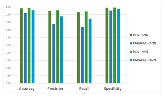Figure 3 shows the average performance metrics for every model, exhibiting the difference between models and the achieved rates per metric. As can be observed, higher metrics were obtained using a combination of PCA–ANN and PCA–k-NN; the accuracy for both pattern recognition algorithms is above 98%, suggesting that PCA successfully extracts the most relevant information for the classification in this dataset. On the other hand, the combinations with PARAFAC achieved the lowest metrics, possibly because three-dimensional analysis includes irrelevant information about the data rather than meaningful features, as shown in Figure 2b.