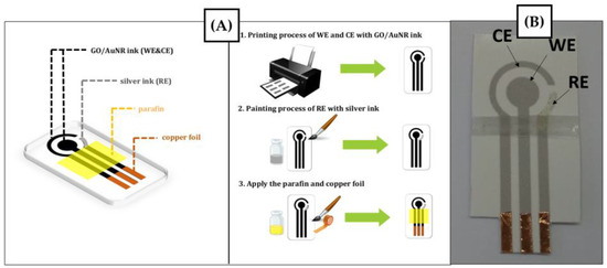 The template of SPE was designed using CorelDraw X7 with reference to the pattern of commercial SPCE provided by Metrohm, as displayed in Figure 1A. The conductive ink was then inserted into a commercial office inkjet printer (Epson EcoTank L121 A4 Ink Tank Printer PT Epson Indonesia, Jakarta, Indonesia) with a substrate of photo paper. The printing of SPE was repeated twice to obtain the homogenous dispersion of conductive ink in the SPE pattern. Silver ink was applied to the pattern of SPE to fabricate the reference electrode. Then, the resulting SPE was dried in the oven for 3 min. Paraffin wax was applied on top of the fabricated SPE as an insulating layer, and copper foil was inserted to provide a connection path to WE, RE, and CE. Figure 1A displays the schematic illustration of the preparation of SPE based on GO/AuNR on the photo paper as a substrate. The resulting SPE based on GO/AuNR fabricated using inkjet printing is shown in Figure 1B.