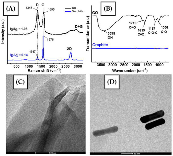 The spectrum of graphite and graphene oxide (GO) for (A) Raman and (B) FT-IR spectra, TEM images for (C) GO, and (D) gold nanorod (AuNR).