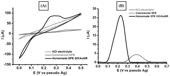 The electrochemical performance of commercial SPCE and SPE-based GO/AuNR was evaluated by measuring 0.2 mM uric acid in 0.1 M KCl using both voltammetric techniques (CV and DPV). The parameters used for the CV technique were similar with a potential range from 0 to +0.5 V (vs. Ag/AgCl), a potential step of 0.005 V, and a scan rate of 50 mV s−1. As shown in Figure 3A, the anodic peak of uric acid oxidation was detected at 0.38 V (vs. Ag/AgCl) using commercial SPCE and at 0.25 V (vs. Ag/AgCl) using SPE-based GO/AuNR. In addition, the observed current of uric acid oxidation at SPE-based GO/AuNR is shown to be 7 times higher than that measured with commercial SPCE.