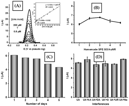 The electrochemical performance of SPE-based GO/AuNR was evaluated using several analytical parameters, such as linearity, limit of detection (LOD), limit of quantification (LOQ), reproducibility, stability, and selectivity. Based on Figure 4A, it is clear the peak current linearly increases with the increasing concentration of uric acid. There are two linear regression equations obtained from DPV measurements of uric acid in a concentration range of 0.2–10 μM (Ipa (μA) = 0.3086 (μM) + 0.9522; R2 = 0.9979) and 10–200 μM (Ioks (μA) = 0.1336 (μM) + 1.4472 (R2 = 0.9911). All measurements of uric acid were performed in triplicate experiments. Then, the values of LOD and LOQ were calculated to be 0.5 μM and 1.0 μM, respectively. In addition, Table 1 shows a comparison of the electroanalytical performance of the proposed sensor for the uric acid sensor with that of previously reported sensors. This tables shows that the proposed sensor displays a comparable performance to the other sensors in terms of linear range, LOD, and LOQ.