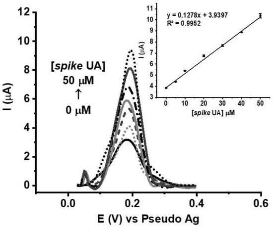 The proposed uric acid sensor (SPE-based GO/AuNR) was employed to determine the uric acid content in samples of human urine. Initially, human urine samples were diluted 50 times and spiked with uric acid using the standard addition method. Figure 5 displays the resulting voltammogram of uric acid measurements from human urine samples using the standard addition method with the corresponding calibration plot (y = 0.1278x + 3.9397; R2 = 0.9952). Based on this regression equation, the concentration of uric acid in the sample of human urine was calculated as 3.086 mM. The uric acid concentration in the sample of human urine was also determined in a clinical laboratory and reported to be 3.45 mM. Therefore, it can be concluded that SPE-based GO/AuNR may have the potential to be employed in real applications as a uric acid sensor.