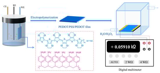 In view of the preparation of gas sensors, the detection sensitivity and response speed of analytes have often been improved by adjusting the microstructure and porosity of gas-sensitive films. Constructing a composite material system with a controlled structural morphology has been an effective way to improve sensor response [3]. The conducting polymer poly(3,4-ethylenedioxythiophene) (PEDOT) film polymerized using electrochemical means has a certain porosity which can improve the adsorption capacity of gas molecules, thereby improving the performance of sensors [4]. Poly(3,4-ethylenedioxythiophene):polystyrene sulfonate (PEDOT:PSS) has the advantages of excellent film processing under a wide selection range of film formation techniques, high tolerance for the choice of substrate, high film conductivity, and easier compositing with other materials, etc. [5], and it has been investigated for the detection of H2O2 in liquid-phase systems using electrochemical methods [6]. In our work, PEDOT:PSS film was evenly coated on an ITO conductive glass substrate with a commercially purchased aqueous dispersion (CLEVIOSTM PH1000) through a desktop coater, and the properties of the film were controlled by the spin-coating conditions, parameters, and drying condition index. PEDOT:PSS/PEDOT composite films were prepared on the basis of the above-prepared PEDOT:PSS films, which were used as working electrodes, by building a three-electrode electrochemical experimental apparatus and using an electrochemical workstation to electropolymerize EDOT monomer using the chronoelectric method. For comparison, PEDOT film was also prepared by electrochemically polymerizing EDOT under the same electrolyte systems. Finally, the resistance signal response of these films to HPV was tested and analyzed contrastively.