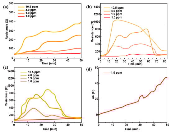 (a) Resistance–time curve of PEDOT film to different concentrations of HPV; (b) resistance–time curve of PEDOT:PSS film to different concentrations of HPV; (c) resistance–time curve of PEDOT:PSS/PEDOT (30 mC) composite film to different concentrations of HPV; and (d) resistance change–time curve of PEDOT:PSS/PEDOT (30 mC) composite film to 1.0 ppm HPV.