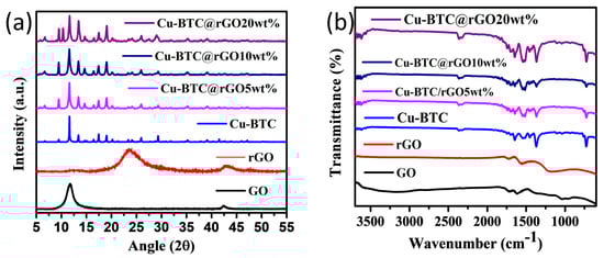 (a) XRD pattern of GO, rGO, Cu-BTC, Cu-BTC@rGO5wt%, Cu-BTC@rGO10wt%, and Cu-BTC@rGO20wt% (b) FTIR Spectra of GO, rGO, Cu-BTC, Cu-BTC@rGO5wt%, Cu-BTC@rGO10wt%, and Cu-BTC@rGO20wt%.