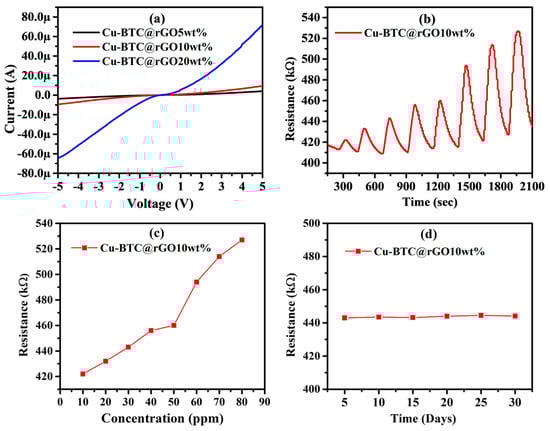 The current–voltage characteristics of synthesized materials were studied using Keithley 4200A (Keithley, Solon, OH, USA) in the potential range of −5 V to 5 V at room temperature and shown in Figure 3a. With the increasing of the rGO concentration, the conductivity of the Ce-BTC@rGO increased significantly. The chemiresistive sensor based on the Cu-BTC@rGO composite was fabricated on copper-coated glass substrate.