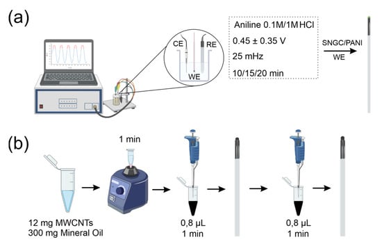 In the first instance, the MWCNT paste was produced using a procedure similar to that found in []. Briefly, 12 mg of MWCNTs and 300 mg of mineral oil were mixed in a vortex for 1 min. Once the solution was homogeneous, 0.8 µL was drop-casted onto the surface of two SNGC electrodes joined by pasting their bodies. The solution was dried at room temperature for 1 min. This drop-casting procedure was performed twice. Finally, the electrodes were dried at 4 °C for 24 h (Figure 1b).