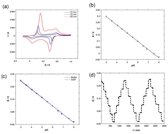 Electrochemical characterization and analytical performance of the SNGC-PANI sensor: (a) resulting cyclic voltammetry obtained with different electrodeposition times, ranging from 10 to 20 min, (b) calibration curve of the pH sensor SNGC-PANI obtained ranging pH from 3 to 8, (c) performance comparison between buffer and artificial interstitial fluid (AISF) media, (d) potentiometry obtained for the reversibility assays ranging pH from 3 to 8.